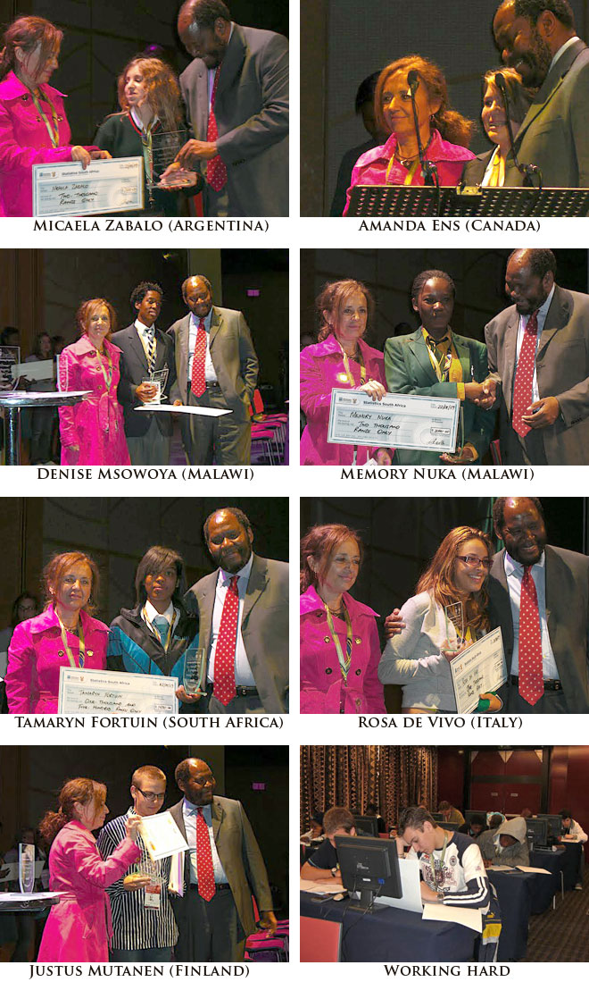 First International Statistical Literacy Competition 2008-2009This competition had three phases and was done in 5 languages without the use of computers: first phase was in the students’ school; second, winners in each school competed nationally for a national champion; third, national champions competed in the final, hosted by Statistics South Africa in Durban, South Africa, August 2009. The reason for having three phases, lasting over a long period and being done in 5 languages was to guarantee the largest participation possible. Phase III wss the final of the competition, fully sponsored by Statistics South Africa under the ISIBALO Capacity Building Program, and organized in cooperation by ISIBALO and the ISLP. Students and teachers met in South Africa during the week of the Biennial Session of the ISI organized by Statistics South Africa and shared the conference venue with delegates from many countries. Students had to analyse sample data and take an examination (produced in five languages). Winners“Dedicated, hard working and ambitious are just some of the words that describe the learners who took part in the ISIBALO International Statistical Literacy Project Competition. All the 44 children who participated in the competition are winners. Their intelligence and willpower is inspirational, and their future in the world of statistics sparkles.” (Zanele Nondzimba, ISIBANE 21 August, 2009, page 3.) Age category 12 to 14